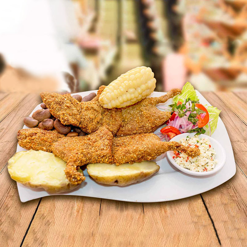 Delicioso cuy crocante preparado al estilo broaster, marinado con especias andinas tradicionales y empanizado con una mezcla especial para lograr una textura dorada y crujiente por fuera, manteniendo la carne tierna y jugosa por dentro. Acompañado de papas doradas, ensalada fresca y ají criollo, este plato combina lo mejor de la cocina tradicional peruana con un toque moderno e irresistible.